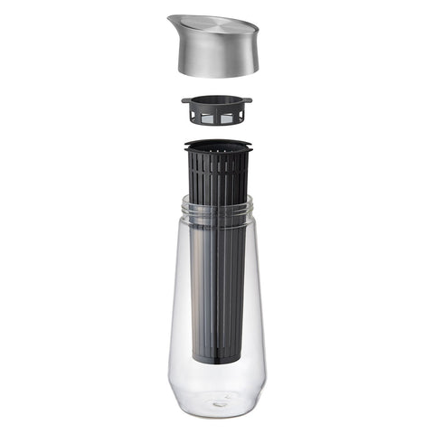 Do not use in a microwave. Do not place near open flames. Make sure that the body and lid are parallel to each other, and close the lid firmly.Do not close the lid tightly when is not parallel to the body as the screw part of the body may be damaged.You may hear screeching noise when you screw the lid as the glass and stainless scrape each other.Keep it horizontally as the container is not completely sealed. Do not hold by the lid when carrying, as the container might fall and break. The filter may become clogged due to the adhesion of coffee oil. To clean the filter, soak in warm water and then wash with neutral detergent. When reinserting the filter in the jug filled with water, sink it slowly as water may overflow due to surface tension around the mesh. To prevent rust, immediately wash and dry well after use. Store it away from other metals.