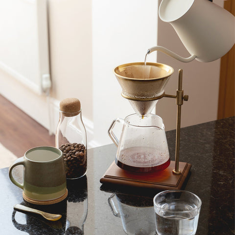 [Stand] Natural wood (Walnut, urethane coating), Brass, 18-8 Stainless steel, Silicone Made in China Slight differences may occur being handmade. Color and grain of natural wood varies in each item. Do not use in a dishwasher. Do not soak in water. Do not place near open flames. Wipe the surface with dry or tightly wrung out dishcloth when cleaning. Sudden temperature change and humidity may warp or crack the product. Avoid direct sunlight, dry well after use and store in a dry place. Slight scratches, darkening, or dents may be found on brass. Do not leave brass wet as humidity may cause the color to change. With continued use, the color of brass surface will change due to oxidation. To clean the brass, use a commercial metal cleaner and follow its directions. There may be a chance that green rust occurs on brass. However, it does not affect quality. When adjusting the height of the stand, hold the ring while unscrewing the knob. [Filter] 18-8 Stainless steel (TiN coating) Dishwasher safe Made in China When using a dishwasher, avoid force and weight applied to the filter. Wash with care. Do not use abrasive cleansers or steel wool. To prevent rust, immediately wash and dry well after use. Store it away from other metals. [Server, Holder] Heat‐resistant glass Maximum temperature differential 120℃/248℉ Microwave and dishwasher safe Made in China Use only for its intended purposes. Do not overheat in the microwave or heat without water. Do not use on a direct fire. Wash with care. Do not use abrasive cleansers or steel wool. Sudden temperature change may break or shatter the product. While the glass is hot, do not pour cold liquids into it and do not place it on a wet cloth or in a wet sink. Product shape and capacity vary in each item due to the nature of the manufacturing process. [Brewer] Heat‐resistant glass Maximum temperature differential 120℃/248℉ Dishwasher safe Made in China Use only for its intended purposes.