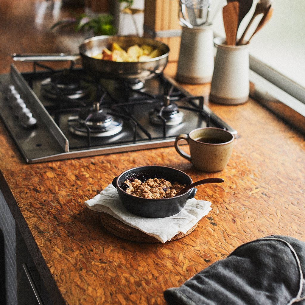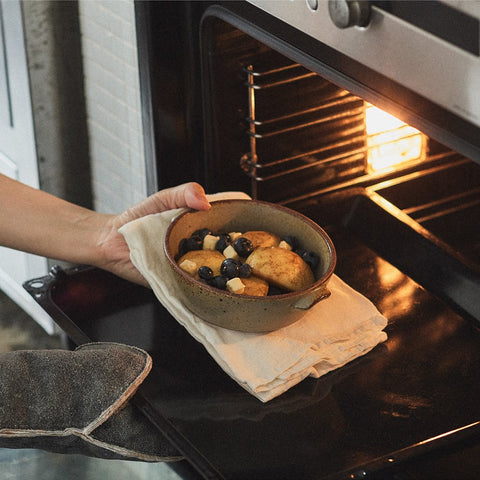 Do not use on direct fire. Do not use with ovens that emit direct flame. Heating frozen food in a preheated oven can damage the product, so please thaw the food before heating. Sudden temperature change may break or shatter the product. Do not overheat in the microwave or heat without water. The product will be hot when heated. Use mittens to hold. Do not place directly on the table while it is hot as discoloration may occur. Use a pot mat.